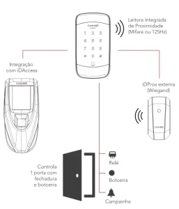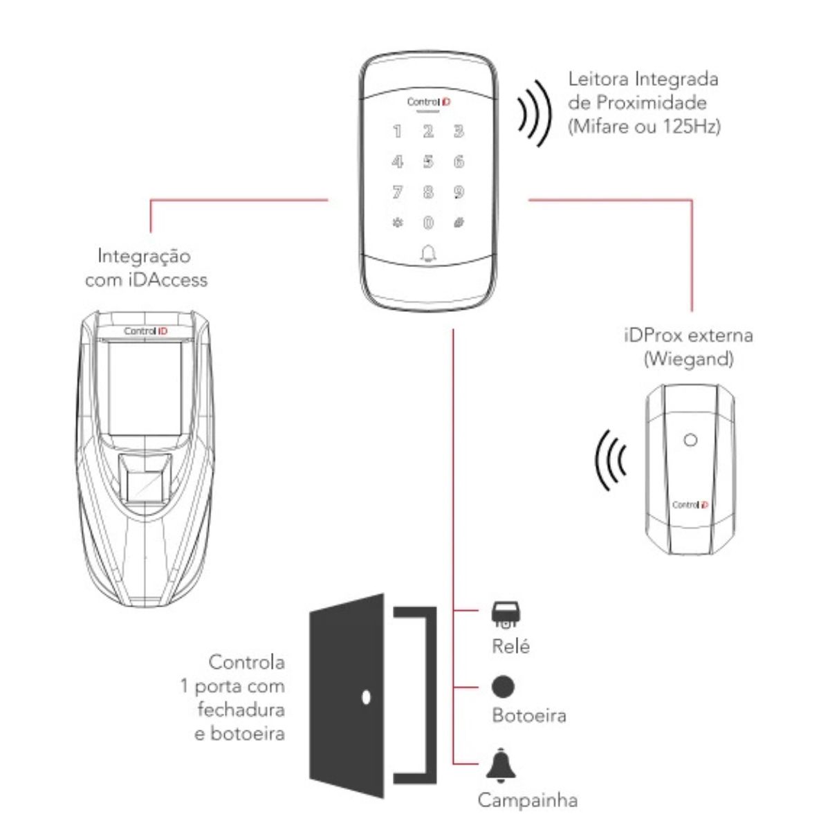 O iDTouch Prox é um controlador de acesso que utiliza senhas ou cartões de proximidade (RFID) para autenticar seus usuários. Seu teclado capacitivo retroiluminado facilita a leitura dos números e a digitação do código de identificação pessoal.
