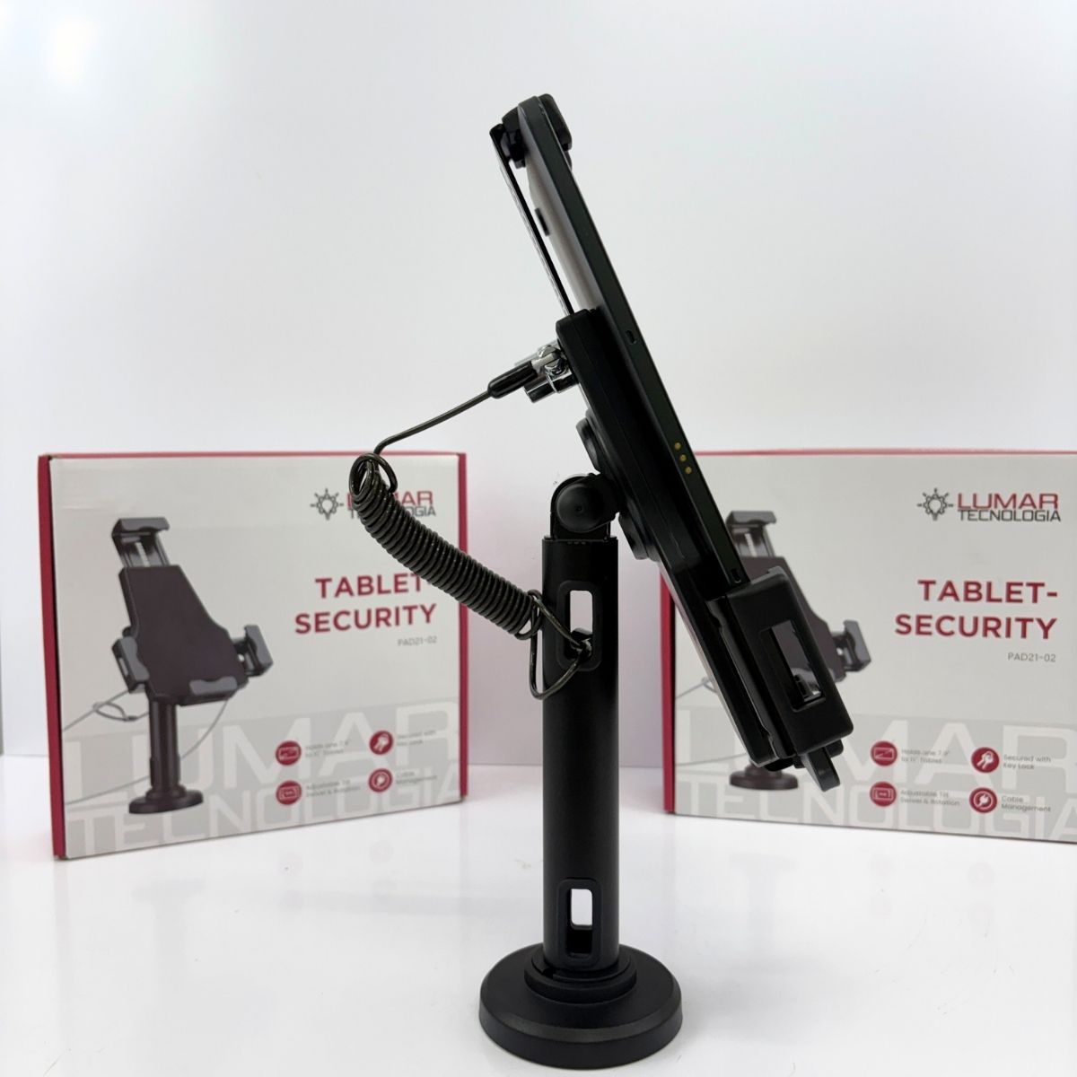 Nesta versão Tablet-Security Premium, o cabo mola possui extensão de até 1 metro, oferecendo mobilidade controlada sem excesso de fios aparentes.