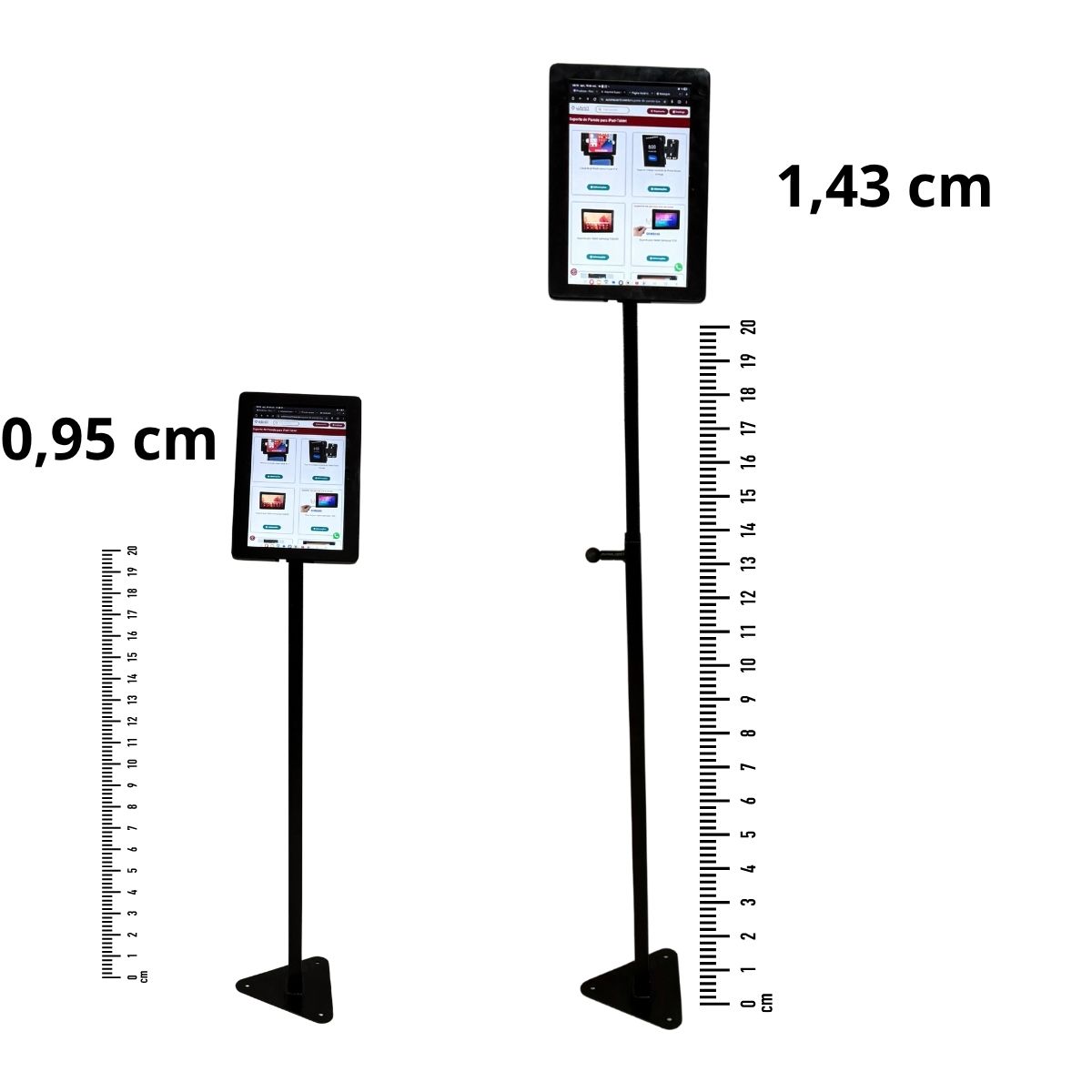 O sistema de regulagem por pino é simples e eficiente, permitindo ajuste de altura entre 0,97 m e 1,43 m. Isso torna o suporte extremamente versátil, adaptando-se tanto ao uso em pé quanto sentado. Se você busca um suporte de piso seguro, ajustável e compatível com os principais tablets do mercado, o Totem Tablet Flex-One é a escolha certa.